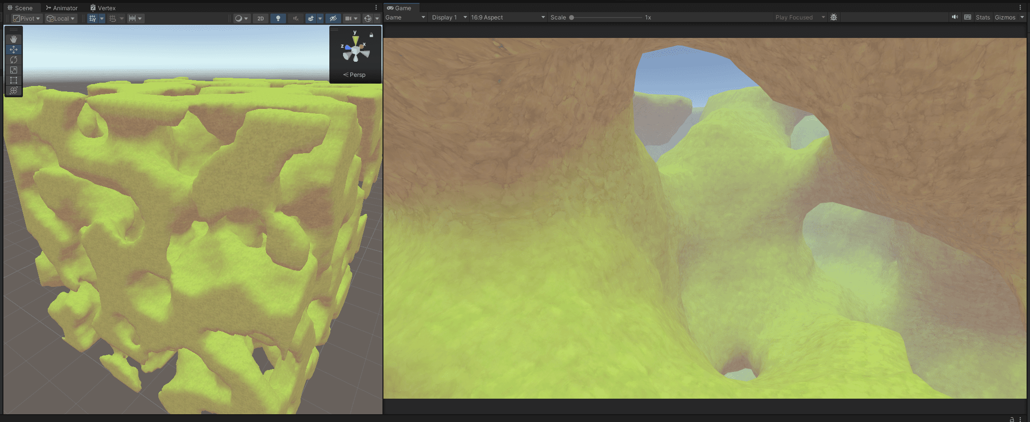 Now, inside of Surface Nets there's even more techniques! I won't go into deep and just say that I went for Naive Surface Nets, which essentially work by averaging every vertex position with the ones that surround them. Sounds simple, but it's hard to get it right at first. It's also not very well documented, so I had to make my own implementation from scratch based on blogs and papers I found online.